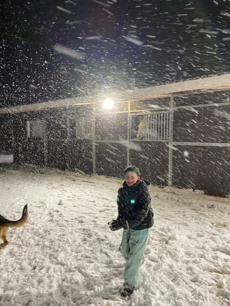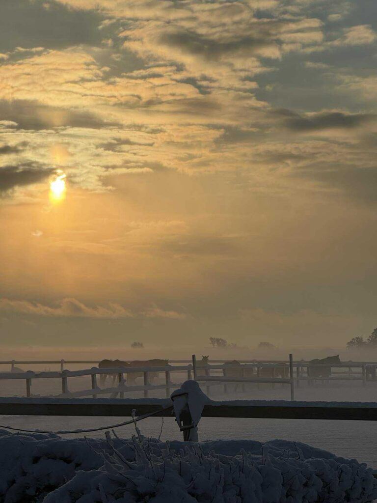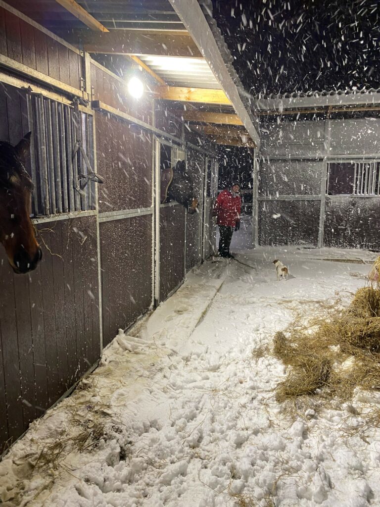 Vintern har verkligen visat sig från sin rätta sida här på Österlen. Just nu är det full snöstorm och gården ligger inbäddad i vitt. Trots vädret rullar vardagen på i lugnt tempo och hästarna trivs bra i våra uteboxar från Cityboxen.